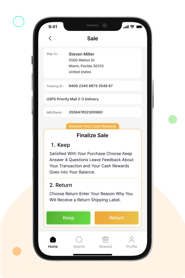 On your sale page you will receive tracking information. Once you receive your device you have 72 hours to Choose Keep or Return. Choose Keep answer a few questions leave feedback and your cash back goes into your reward balance.